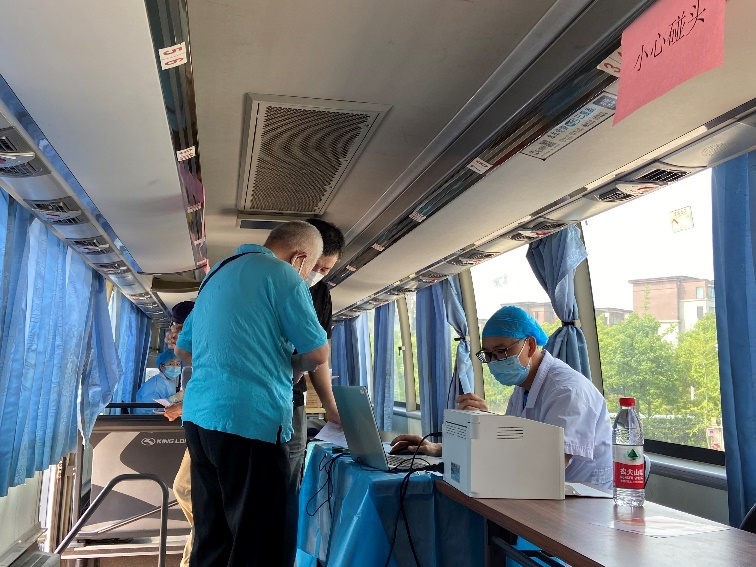 医护人员建议患高血压的老同志要注意在饮食方面少油少盐,若有其他健康问题需要咨询专家。测量血压结束后可到疫苗车上接种疫苗,留观半个小时后若身体无大碍即可领取福利离场。