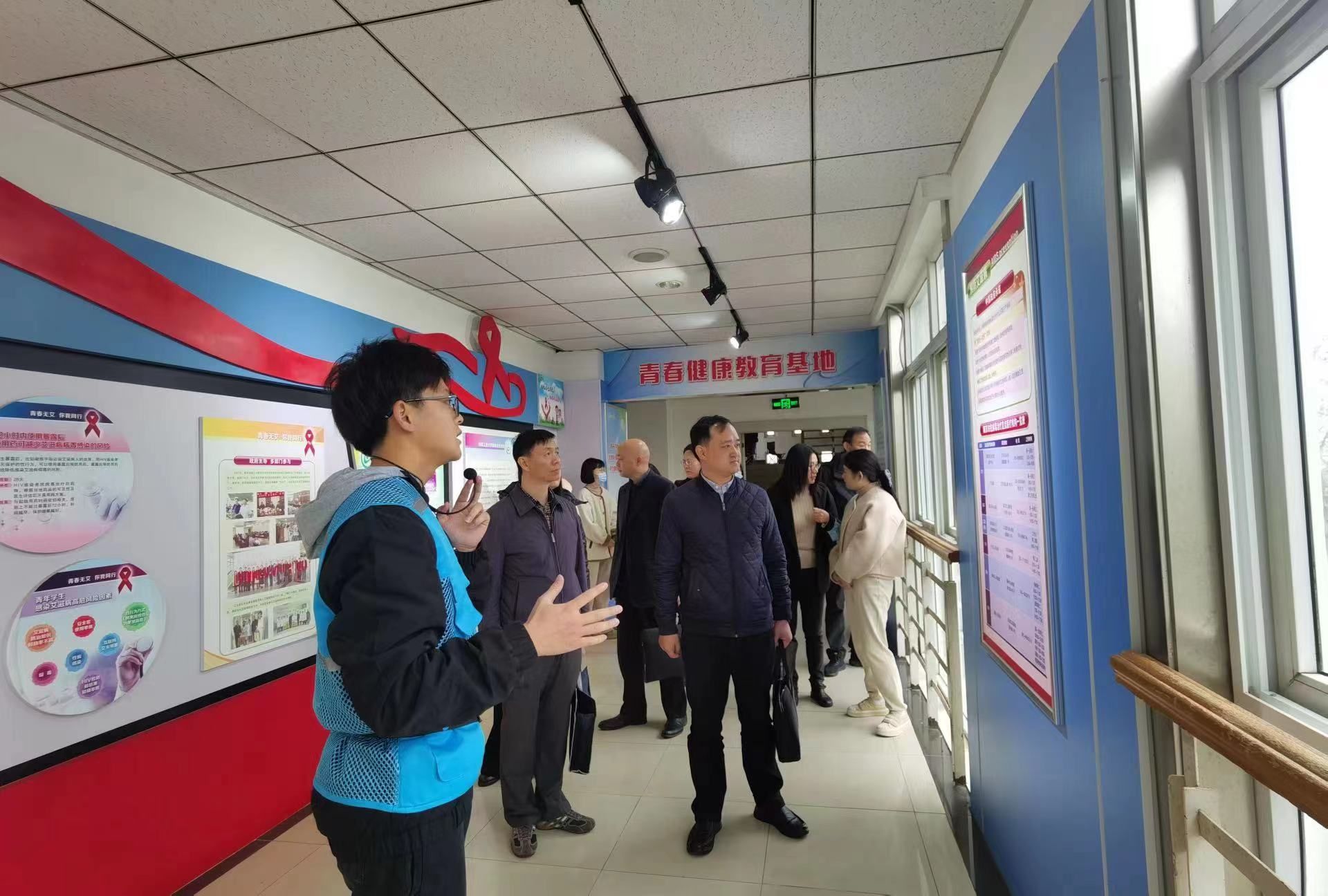 首先校医院院长丁春卉向专家组介绍了我校免费安全套智能发放机投放、艾滋病抗体检测试剂盒发放等方面情况,专家们查看了校内免费智能机运行情况。随后专家组一行来到同和楼6楼参观了我校青春健康教育基地,青春健康协会学生向专家组详细介绍了基地的发展以及大学生防艾禁毒宣传。