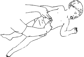 施救者用两手的中指和食指,放在患儿胸廓下和脐上的腹部,快速向上重击压迫,但要很轻柔,重复之,直到异物排出。