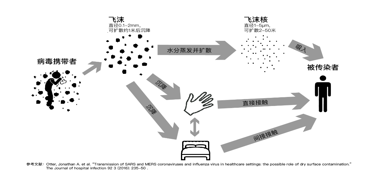 病毒通过咳嗽、喷嚏、说话等产生的飞沫释放到空气中,沉降后可附着在物体表面。飞沫中水分蒸发变成飞沫核,携带病毒可扩散至较远地方。